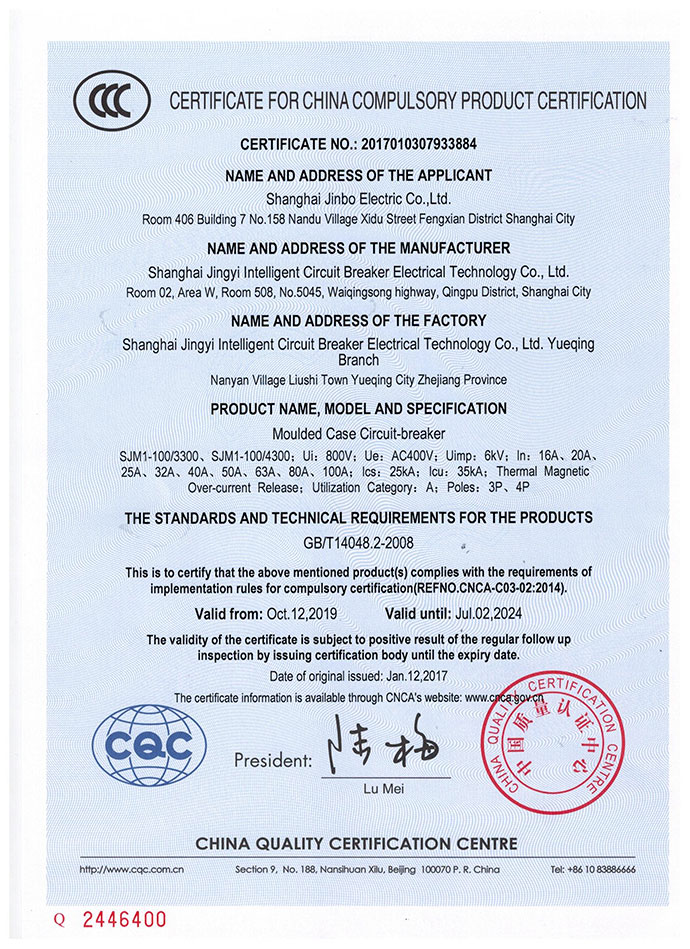 SJM1-100塑料外壳式断路器3C证书英文