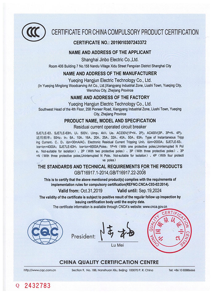 SJE7LE-63漏电断路器3C证书英文