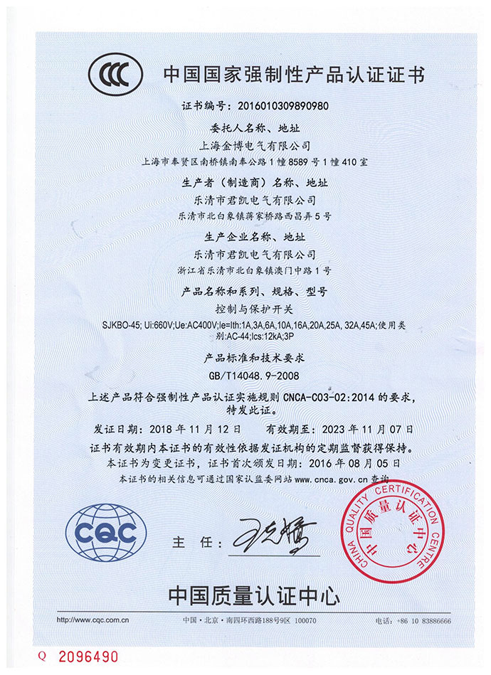 SJKBO-45控制与保护开关3C证书中文