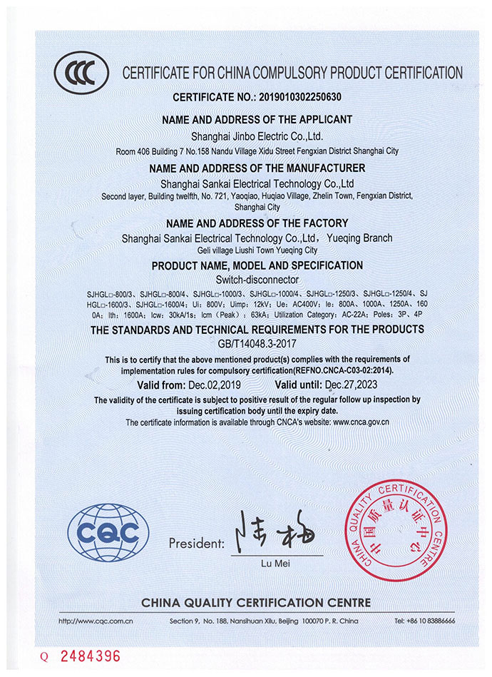 SJHGL□-800隔离开关3C证书英文