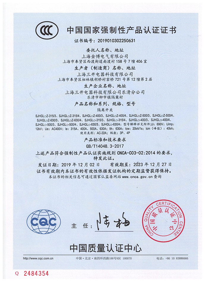 SJHGL□Z-315隔离开关3C证书中文